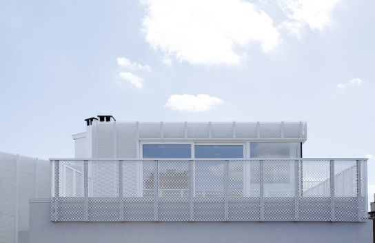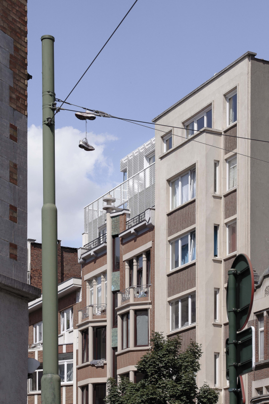 The Boulevard d'Ypres and the Quai du commerce form an angle leading to the south on the shore gate. It was almost at the end of this block that two identical buildings were built in 1933, each opening onto one of the two avenues and meeting in the center of the crossing plot, creating a patio allowing light to be rear of the dwellings making up the building. The two facades visible from the public space are strictly identical. Inspired by art-deco, they were designed by Teughels, the architect of the complex. The double extension project was designed to adapt to this double situation by working the volume in a different way to adapt to the built templates of the street. The former maids' rooms have thus been reworked and raised to recompose the perspective in the street by harmonizing with the volumes already in place. In order to preserve and enhance the original building, the extensions have been set back. The railing of the passageway thus formed coming to cap the building by passing behind the old ornate pediment. The volumes have been cladded with a perforated skin in light aluminium. The load-bearing structure, under the skin, is perceptible and gives a rhythm to the whole which extends the structuring elements of the old facade.