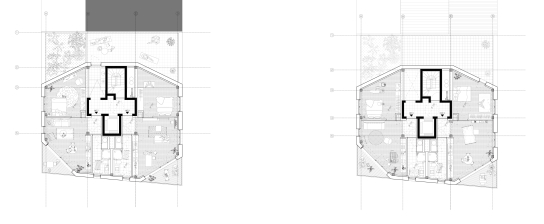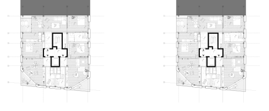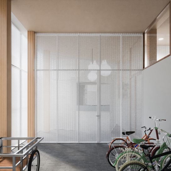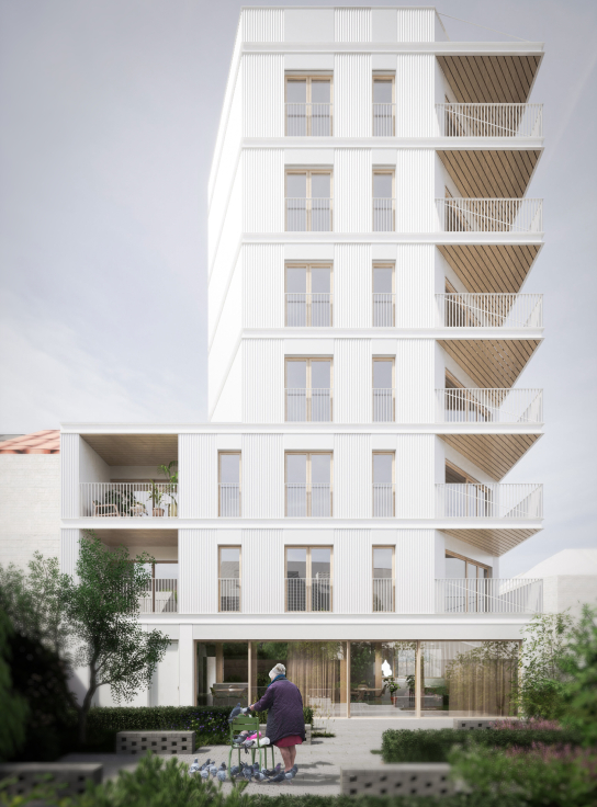 Near the Verboekhoven intersection and the Lambermont boulevard, which are structuring axes in the district, the project plot is located in the northern part of Schaerbeek. The new metro axis will one day allow a greater flow to be drained towards the station and the centre of Brussels and will promote a gentle densification of this residential area. The project in question here makes it possible to anticipate this urban change and anticipate this new polarity. Bourgeois facades with cast iron railings and elaborate ornamentation are replaced by simpler housing, witnesses to the industrial character of 19th century Schaerbeek, our project also assumes to be the witness of its time. In the district, it is not uncommon to see the slanted span, at the corner of a street, topped with dormers, turrets, and bell towers. Thus creating an event in the facade alignments supporting the transition between two universes. The volumetric resolution that we propose is to enhance the angulation by attaching the building's template to the neighboring adjoining wall but by raising it at the corner to address the project to the public space - whether it is the street or the future metro esplanade.