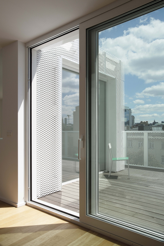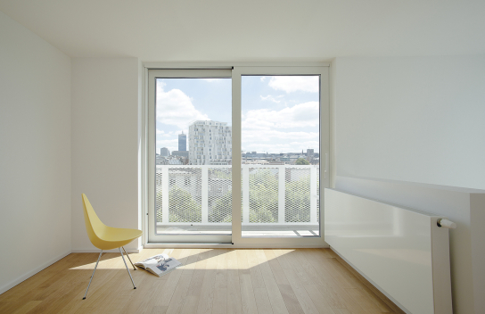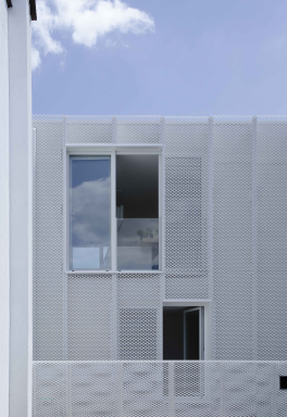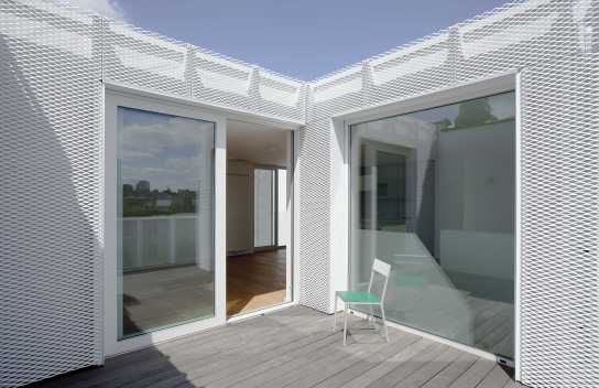 The Boulevard d'Ypres and the Quai du commerce form an angle leading to the south on the shore gate. It was almost at the end of this block that two identical buildings were built in 1933, each opening onto one of the two avenues and meeting in the center of the crossing plot, creating a patio allowing light to be rear of the dwellings making up the building. The two facades visible from the public space are strictly identical. Inspired by art-deco, they were designed by Teughels, the architect of the complex. The double extension project was designed to adapt to this double situation by working the volume in a different way to adapt to the built templates of the street. The former maids' rooms have thus been reworked and raised to recompose the perspective in the street by harmonizing with the volumes already in place. In order to preserve and enhance the original building, the extensions have been set back. The railing of the passageway thus formed coming to cap the building by passing behind the old ornate pediment. The volumes have been cladded with a perforated skin in light aluminium. The load-bearing structure, under the skin, is perceptible and gives a rhythm to the whole which extends the structuring elements of the old facade.