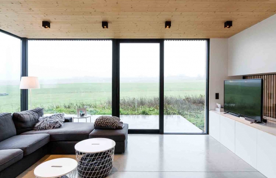 This family house, located in the countryside of Namur, is the proof that you can make architecture with few ressources. The construction site had many strenghts; like an unobstructed view over the fields, a south-west orientation, a slight slope... The command was to build a small house with three bedrooms and one bathroom on a thight budget. During the design process, we made the choice to implement small spaces with large openings to highlight the views over the garden, in order to create a sensation of space and to get profit from the heat of the sun in the wintertime. An other way to improve the qualities of the house without make it bigger was to create polyvalent spaces melting into each other. The entrance, is located in the staircase, on a split level. A bookshelf separates it from the living room and this piece of furniture is also the balustrade of the study room upstair. This combination aids greatly in creating a spacious feeling. The house is very performant, it’s well insulated and it’s only heated by a wood stove.